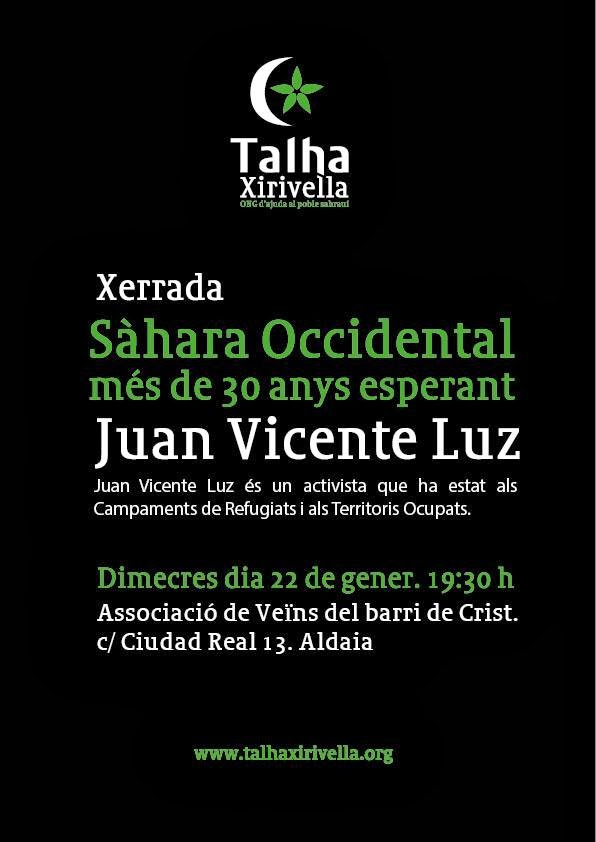 El proper dimecres dia 22 de gener, a les 19:30 h., celebrarem una xerrada a l’Associació de Veïns del Barri el Crist (C/ Ciudad Real, 13, a la part d’Aldaia) organitzada per Talha Xirivella. Hi participaran Juan Vicente Luz, activista que ha estat tant als campaments de refugiats sahrauís, com d’observador internacional als Territoris Ocupats pel Marroc, que ens explicarà la qüestió del Sàhara. I d’altra banda, intervindrà Ahmed Ettanji, activista i president de Equipo Mediatico(grup d’informació dels TT.OO, que ens parlarà de la campanya nacional i internacional per a l’ampliació de les competències de la MINURSO perquè incloguen la vigilància dels Drets Humans al Sàhara Occidental, dirigida per la Cooperació de les Associacions Sahrauís dels Drets Humans, a més de tota la població sahrauí.